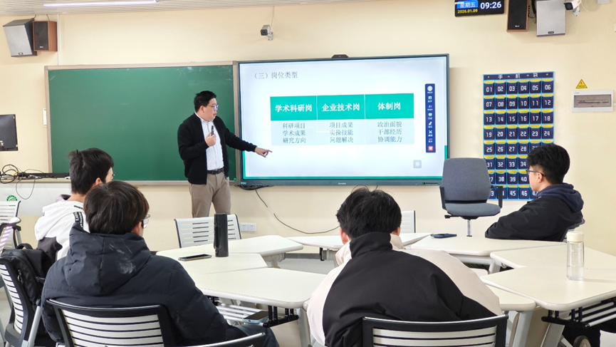 面向研三学生的就业压力与职业决策需求,学院于1月9日同步开展“就业赋能专项行动”。研究生辅导员袁志军老师深入解析就业形势,详解四类就业赛道特点,提供五阶段求职规划,分享面试技巧与防陷阱指南,并整合就业资源,为2026届毕业生提供系统指导。学院还依托“彩虹花”职业规划工作室提供一对一咨询,助力毕业生提升竞争力、缓解求职焦虑。